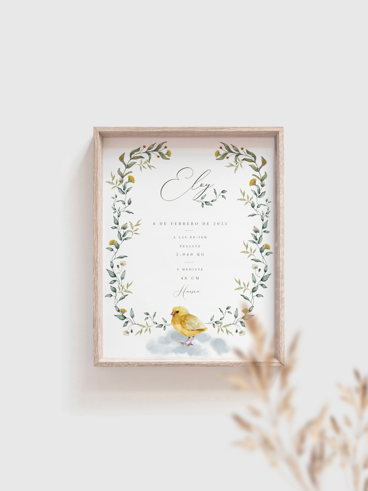 El diseño de esta lámina incluye acuarelas vegetales y una tierna acuarela de un pollito. Si hay algún dato del formulario que desconoces, puedes dejarlo en blanco y nosotros adaptaremos el diseño.